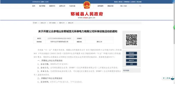 6月3日至5日,郓城威廉希尓指数500组织开展公众参观公司环保设施活动。活动分线上与线下两部分。公众既可通过关注企业公众号线上参与,也可通过预约报名的方式线下参与。为做好预约报名工作,郓城威廉希尓指数500将已编制的《2020年“六·五”环境日宣传工作实施方案》在郓城县人民政府网站公示,同时将6月5日设为公司环保设施公众开放日。