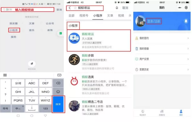 第一步:微信搜索“蚂蚁收运”小程序,并进行注册登录:
