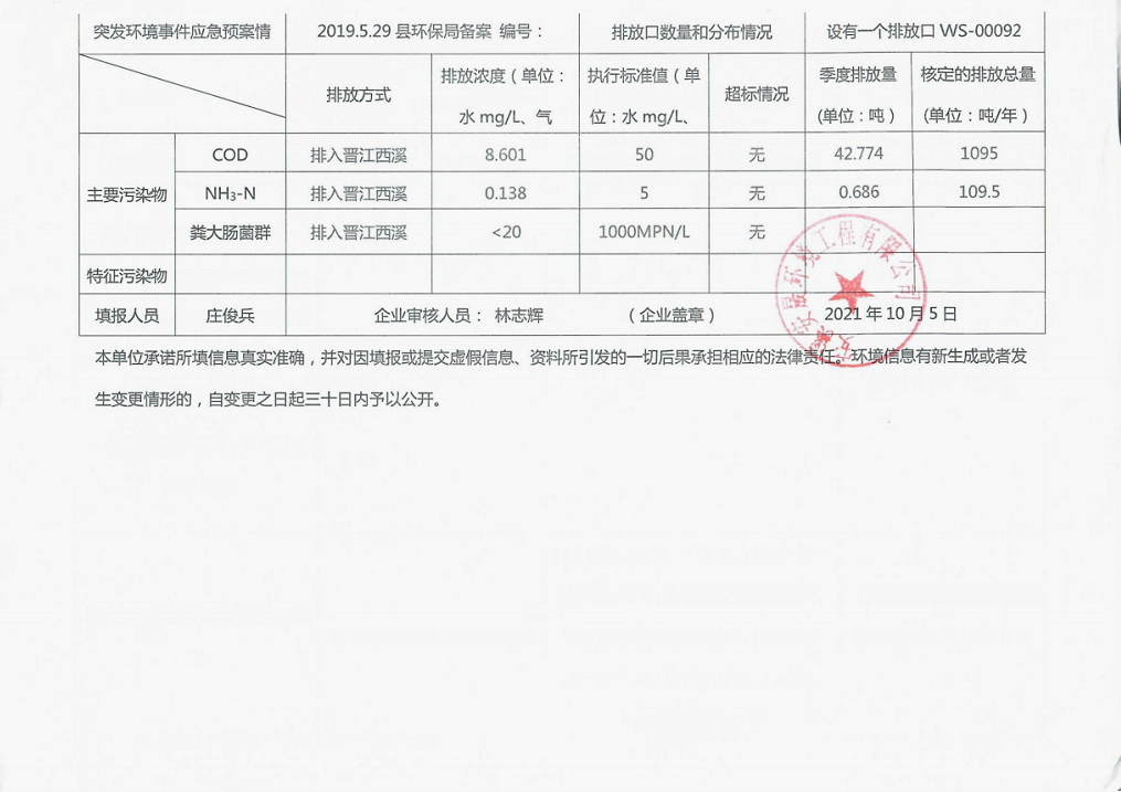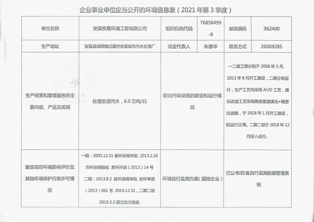 安溪城市污水处理厂2021年第3季度环境信息公开