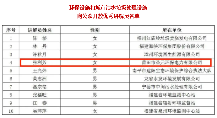 近日,福建省生态环境厅、福建省住房和城乡建设厅公布环保设施和城市污水垃圾处理设施向公众开放优秀案例、优秀讲解员入选名单 。“泉州市宝洲污水处理厂向公众开放”、“莆田威廉希尓指数500社区共享中心”被评为环保设施向公众开放优秀案例,莆田威廉希尓指数500张利芳被评为环保设施向公众开放优秀讲解员。