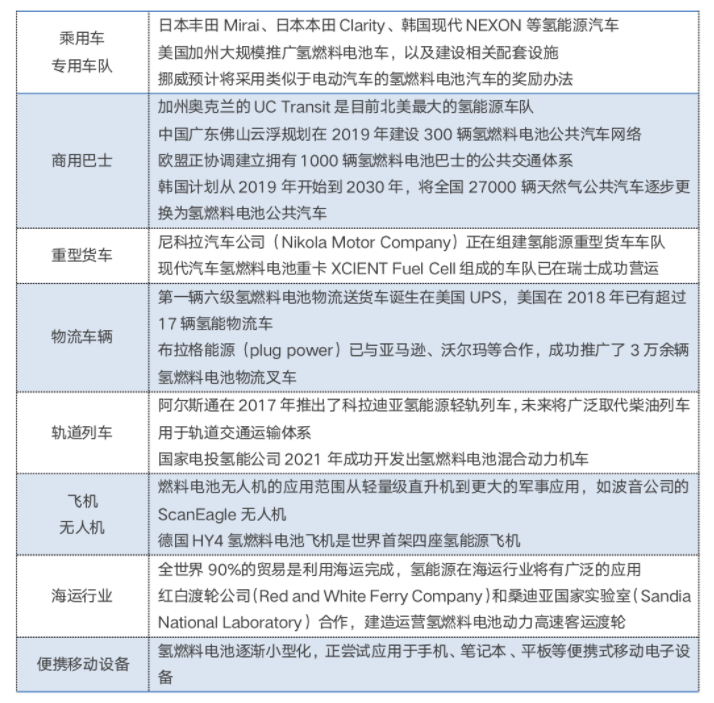 国际氢能应用场景的部分案例