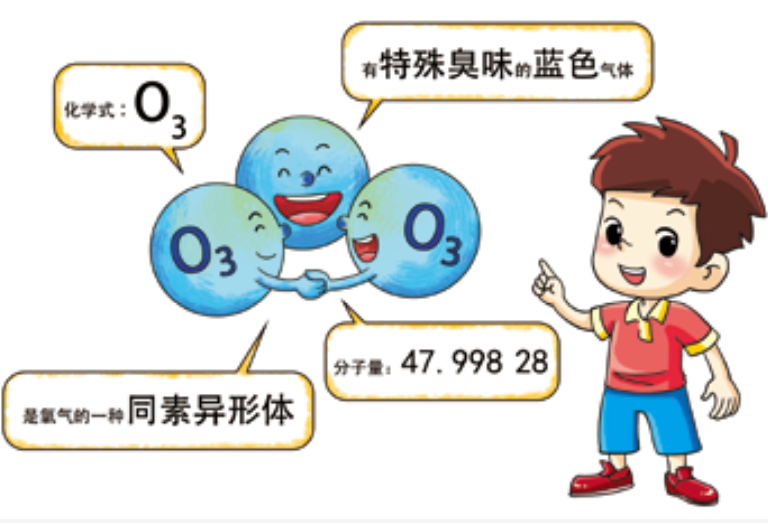 臭氧(O3)是天然大气的重要微量组分,分子量为47.99828。大气中的氧分子受太阳辐射分解成氧原子后,氧原子又与周边氧分子结合,可以形成O3,因此,O3含有3个氧原子,是氧气的一种同素异形体。在常温下,它是一种有特殊臭味的蓝色气体。