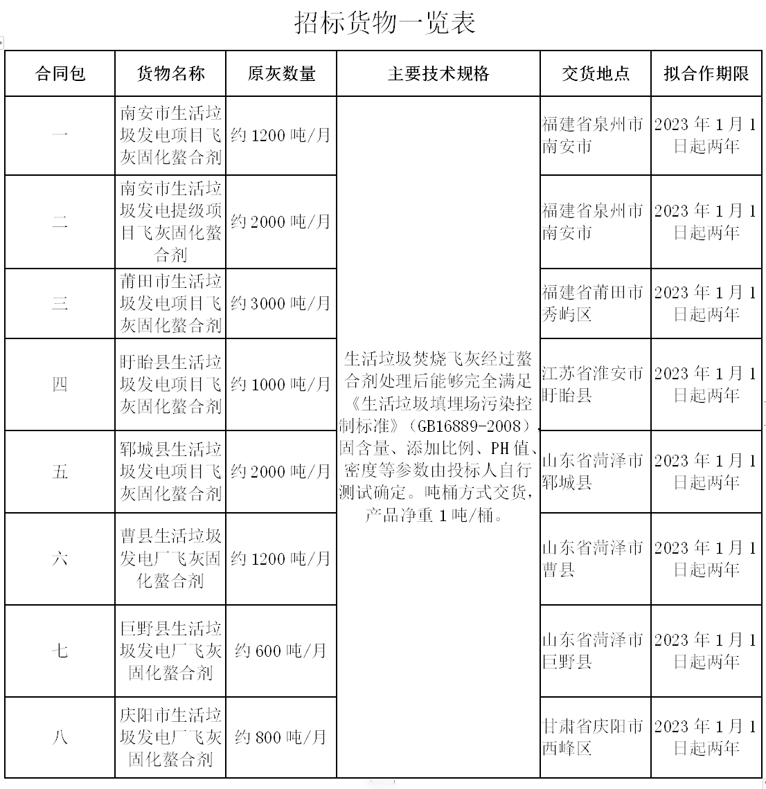 威廉希尓指数500股份有限公司对南安市生活垃圾焚烧发电厂、南安市生活垃圾焚烧发电厂提级项目、莆田市生活垃圾焚烧发电厂、盱眙县生活垃圾焚烧发电厂、郓城县生活垃圾焚烧发电厂、曹县生活垃圾焚烧发电厂、巨野县生活垃圾焚烧发电厂、庆阳市生活垃圾焚烧发电厂飞灰固化螯合剂采购项目的下述货物及服务进行国内公开招标,现欢迎国内合格的投标人前来提交密封的投标。