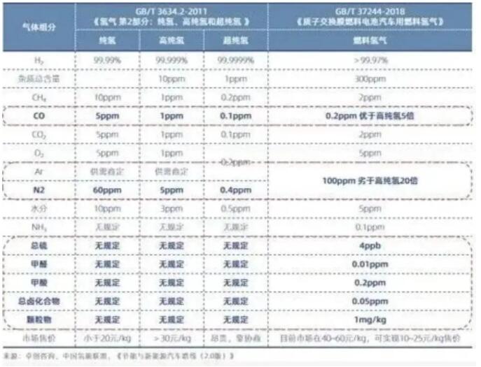 质子交换膜燃料电池用氢气的纯度要求低于工业用纯氢、高纯氢、超纯氢的纯度要求,但其对杂质含量的要求远比工业用高纯氢、超纯氢的更为严格,不仅对常规烃类、CO、CO2、N2、Ar、水蒸气等杂质含量进行了限定,而且对总硫、总卤化物、甲醛、甲酸、氨等杂质的含量也进行了严格限定。