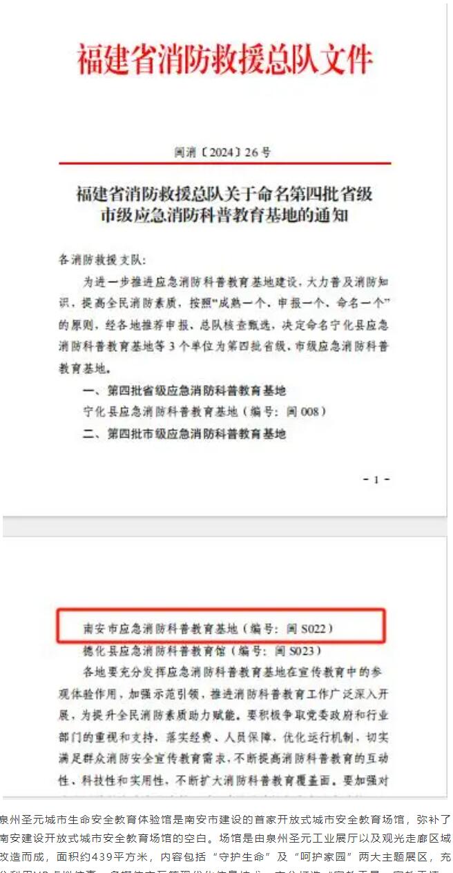 近日,经福建省消防救援总队核查甄选,决定命名泉州威廉希尓指数500城市生命安全教育体验馆为市级应急消防科普教育基地。