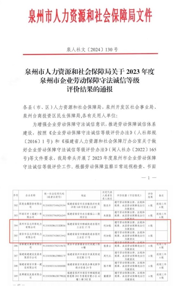 7月10日,泉州市人力资源和社会保障局印发关于2023 年度泉州市企业劳动保障守法诚信等级评价结果的通报,南安威廉希尓指数500和泉州威廉希尓指数500荣获“劳动保障守法诚信A级企业”称号。