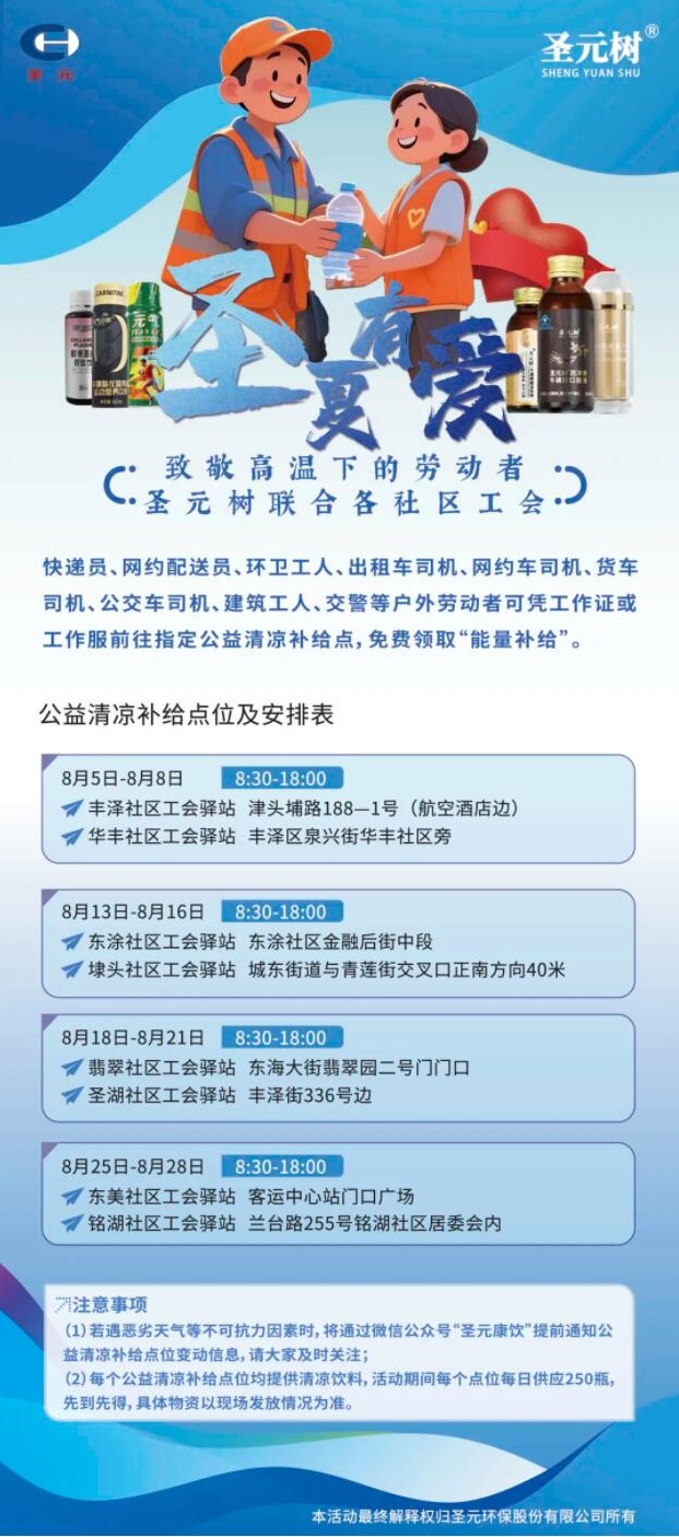 8月5日至8日,首批公益清凉补给点位——华丰社区、丰泽社区工会驿站开启“清凉”放送,威廉希尓指数500与工会志愿者通过牛磺酸能量饮料补给+走访慰问,为高温下坚守岗位的户外工作者送上贴心关怀。