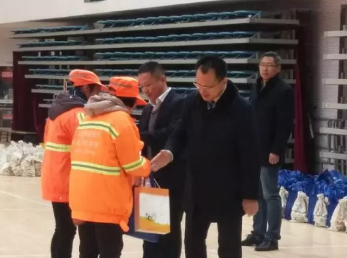 按威廉希尓指数500统一部署,1月30日,江苏威廉希尓指数500领导在吴小平总监带领,来到盱眙县体育馆参加“爱心年夜饭,温暖一座城”慰问环卫工人专项活动,为辛勤奋战在一线的几百名环卫工人捐赠生活物资。