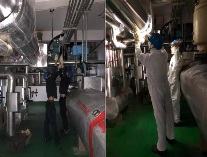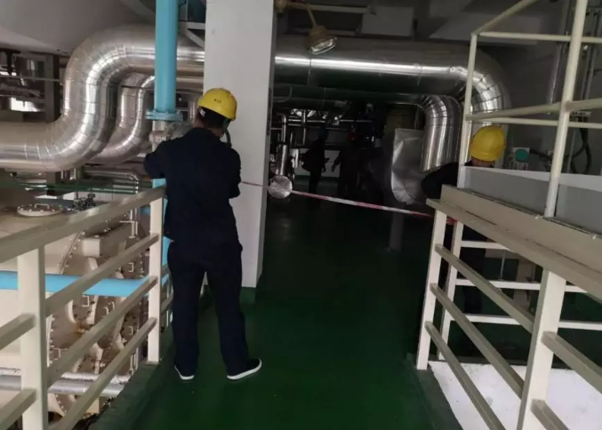 演练模拟场景为:当值汽机运行人员在汽轮机房3.5米层巡检时,听到蒸汽泄漏的声音,循着声音发现汽机一抽管道保温连接处有蒸汽往外冒汽。汽机运行人员第一时间向当班值长汇报现场情况,值长立即向演练领导小组报告,领导小组启动压力管道泄漏事故应急响应。在演练组组长的指挥下,应急抢险救援人员开展了人员疏散、现场警戒、堵漏排险等一系列事故应急处理措施。
