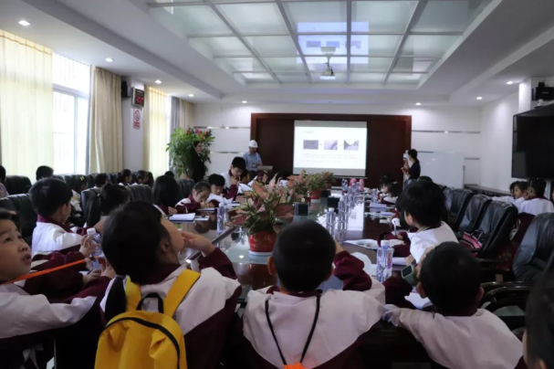 厂区门口,小记者们四处观察、兴趣盎然,只见旁边挺立着一个显示实时烟气排放数据的LED屏;前方不远处,厂房与青山相互掩映;厂区内像公园一样干净、整洁。在会议室,生产部经理张维峰通过PPT、短视频等形式,深入浅出地向小记者们介绍公司基本概况及垃圾处理工艺流程。
